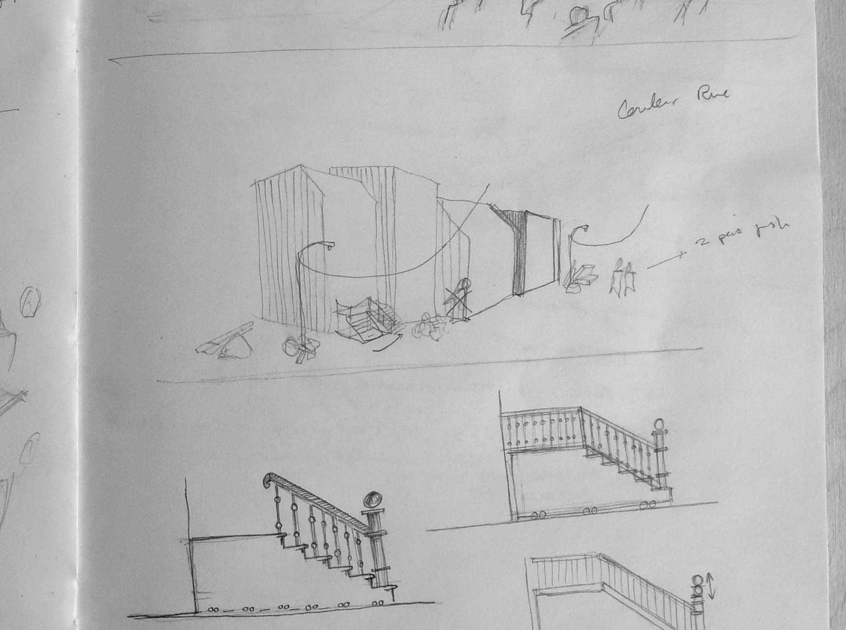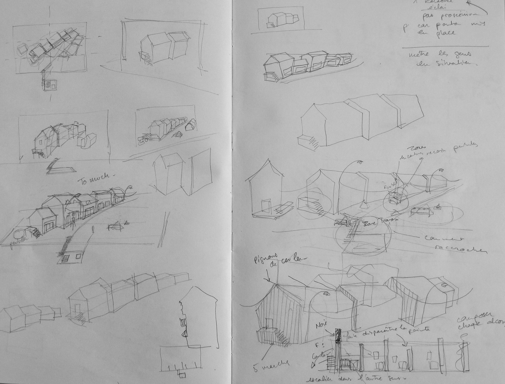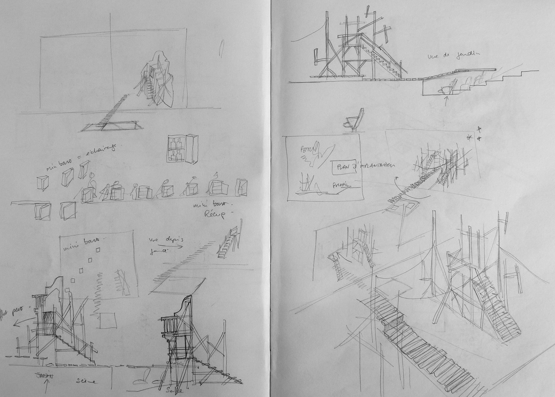 Au début, une envie de décor de cinéma en bois, vu à l'envers : des chassis apparents, des escaliers, un ponton...