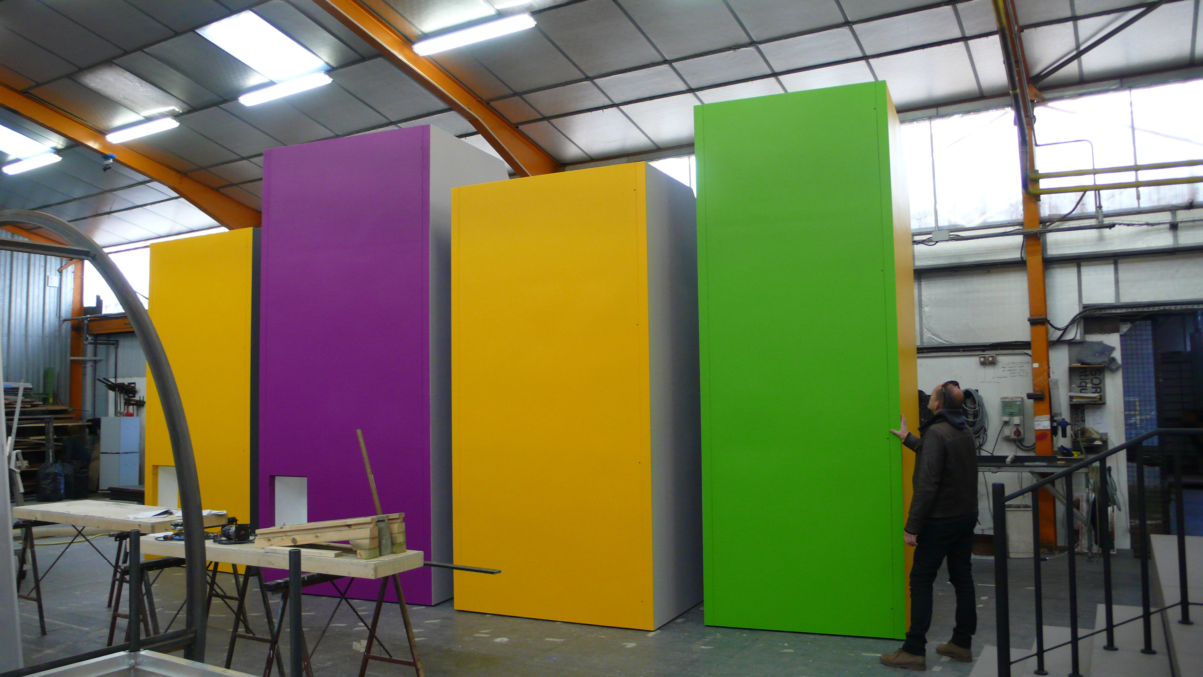 La construction : les ateliers du Grand T à Nantes ont porté un soin particulier sur la fluidité et le silence des mouvements des cubes, et sur la qualité des aplats de couleurs sur toutes les faces.
